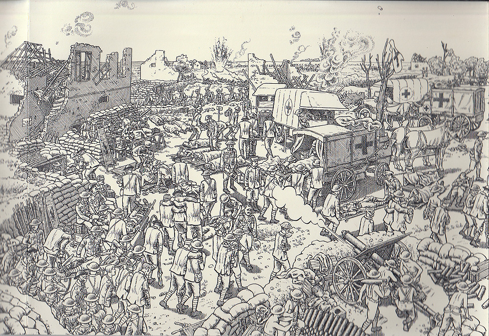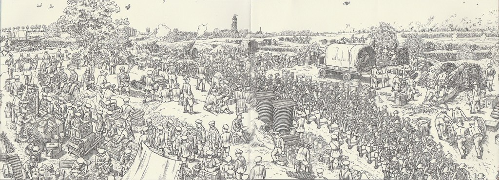 Taking his inspiration from the Bayeux Tapestry and its sequential depiction of the 11th-century Norman invasion of England, Sacco uses the expanse of the illustration to depict a progression in both time and space. As you view it left to right, it moves from the Montreuil-sur-Mer headquarters of General Douglas Haig, commander of the British forces on the Western Front, through the trenches and battlefields of the Somme, eventually to burial sites in the makeshift cemeteries on the Allied-held ridges.